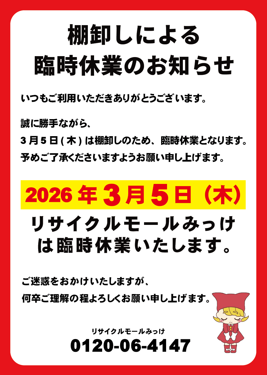 誠に勝手ながら、棚卸しのため下記の日程を臨時休業とさせていただきます。